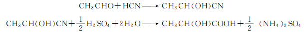 (1)乙醛法 以乙醛與氫氰酸為原料反應(yīng)生成乳腈,經(jīng)水解得粗乳酸,粗乳酸經(jīng)酯化再水解得乳酸: