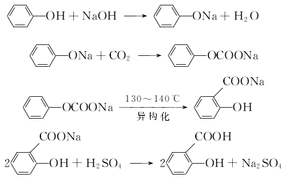 將酚與50%氫氧化鈉按1:1.02(mol)配比加入反應(yīng)器中進(jìn)行反應(yīng)脫水,控制游離堿≤1%,減壓脫水后,再加酚作溶劑共沸脫水。然后將酚鈉在酚中通入干燥的二氧化碳?xì)怏w,進(jìn)行羧化反應(yīng)3h后,第二次通入二氧化碳2h,再減壓回收酚,即羧化完畢。再向上述水楊酸鈉溶液中,加入水溶解成50%的溶液,在攪拌下加入7%-8%的酸化至pH值1-2,然后冷卻過濾,真空干燥,即得水楊酸粗品,再將粗品在減壓下升華,可得含量為99%的成品水楊酸,收率50%-70%。(2)中壓法    仍以酚為原料,先制成酚鈉,在中壓下用二氧化碳進(jìn)行羧基化,生成碳酸酚酯,然后加壓進(jìn)行分子重排,生成水楊酸鈉,再經(jīng)酸化后處理制得水楊酸。   將酚用50%液堿中和,真空干燥,然后將釜溫冷卻至100℃,慢慢通入干燥的二氧化碳,當(dāng)釜內(nèi)壓力達(dá)0.7-0.8Mpa時,停止通二氧化碳,此時生成碳酸酚酯鈉,然后在130-140℃下發(fā)生分子內(nèi)重排異構(gòu)化,變?yōu)樗畻铘肉c,再用酸化,得水楊酸粗品。將粗品在減壓下升華,即得水楊酸精品,含量99%,收率達(dá)98%以上。消耗定額(kg/t):酚(98%)704,燒堿(95%)417,(95%)500,二氧化碳(99%)467。 (3)制法 酚與氫氧化鈉反應(yīng)生成酚鈉鹽,然后再與二氧化碳合成鄰羥基甲酸鈉,經(jīng)酸化制得水楊酸:粗品用水溶解后經(jīng)活性炭脫色,再重結(jié)晶提純。(4)將相同物質(zhì)量的酚和50%的氫氧化鈉在105~130℃下反應(yīng)生成酚鈉,控制游離堿1%以內(nèi)。反應(yīng)結(jié)束后,減壓脫水,再用酚為溶劑共沸脫水。冷卻至100℃后,通入干燥的二氧化碳進(jìn)行3h羧化反應(yīng),溫度由128℃升至200℃。待溫度下降后,回收溶劑酚,2~3h后,再通入二氧化碳羧化2h,減壓回收酚。( 羧化的另一種方法是在140~180℃通二氧化碳,控制反應(yīng)壓力為0.7~0.8MPa進(jìn)行羧化反12h。 )羧化反應(yīng)結(jié)束后,加水溶解水楊酸鈉,調(diào)成50%的溶液,邊攪拌邊加入7%~8%的溶液,使ph值達(dá)1~2,冷卻、過濾、甩干,用水洗滌數(shù)次,甩干后,再用蒸餾水加熱溶解,加入少
