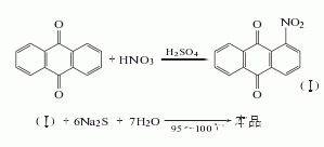 1.硝化還原法 蒽醌經(jīng)混酸硝化得硝基蒽醌,反應(yīng)產(chǎn)物過濾并用熱水洗至中性后,用亞鈉精制。其中2-硝基蒽醌與亞鈉生成易溶于水的蒽醌-2-磺酸鈉,過濾后洗滌除去之。所得1-硝基蒽醌用硫化鈉還原得1-氨基蒽醌粗品,經(jīng)加堿液、保險粉精制除去二氨基蒽醌后再用氧氣氧化、過濾、干燥,得成品。