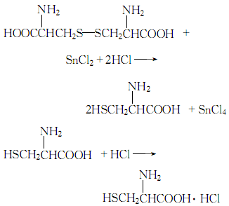 1.將胱氨酸溶于稀鹽酸中,過(guò)濾加入錫粒升溫回流。將還原液用水稀釋,移去剩余錫粒,通過(guò)硫化氫使飽和,過(guò)濾,濾渣用少量水洗,將洗液、濾液合并,減壓濃縮,冷卻結(jié)晶,干燥得鹽酸l-半胱氨酸。